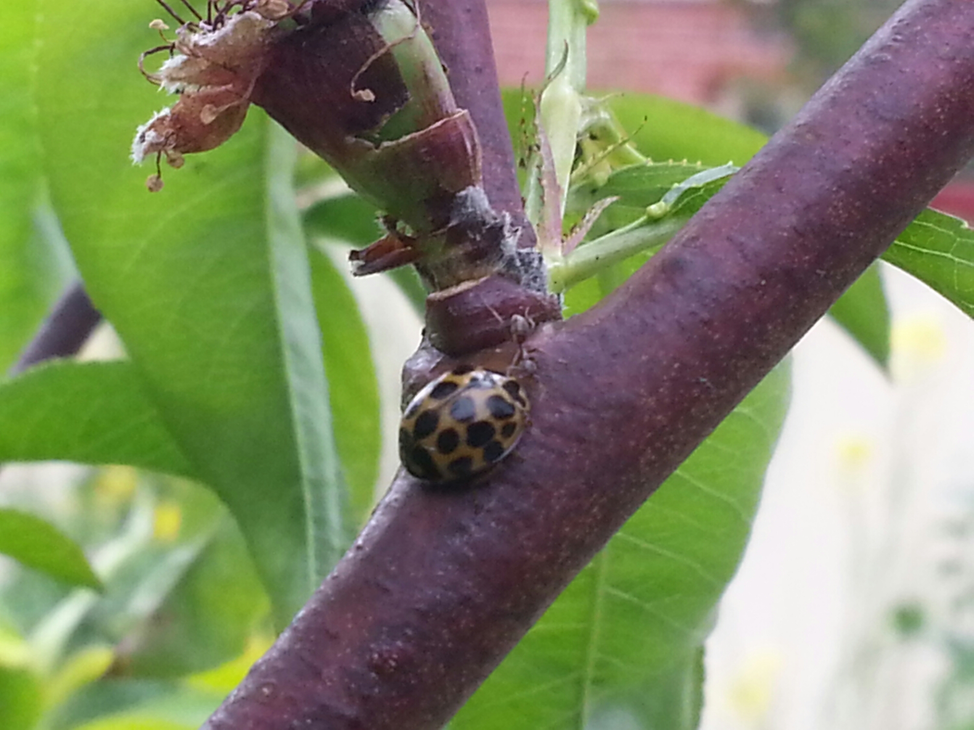 My Nectarine nemesis is once again covered in black aphids… but hopefully not for much longer…. the ‘Lady Birds’ have landed!